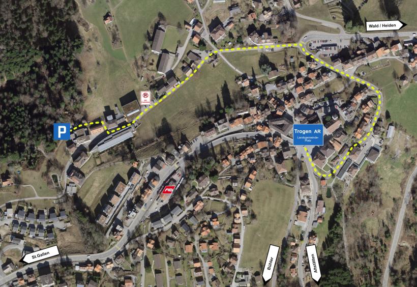 Vom zentral gelegenen "Landsgemeinde-Platz" in Trogen fahren Sie auf der Hauptstrasse Richtung Wald / Rehetobel / Heiden.