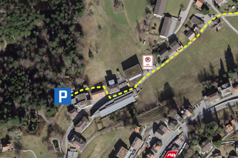 Fahren Sie am "Palias Bleu" vorbei, bis Sie nach ca. 300 Metern den "Mitarbeiterparkplatz" bei der Aula unserer Schule erreichen.